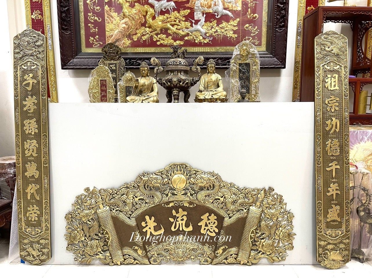 Bộ cuốn thư câu đối hoa hồng bằng đồng màu giả cổ, kích thước 1m76