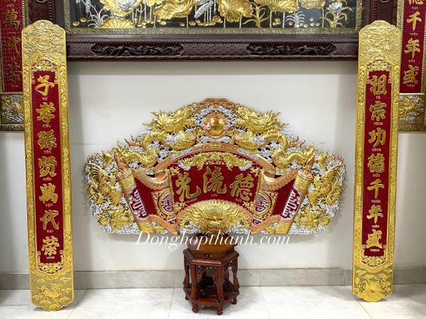 Bộ cuốn thư song long chầu nguyệt dát vàng bạc, kích thước 1m76