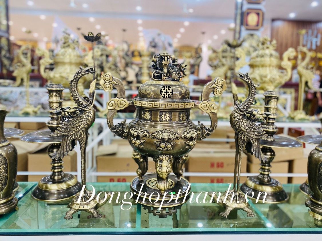 Đỉnh đồng: Mẫu đỉnh được làm theo dáng bầu tròn truyền thống. Phía trên phần nắp đỉnh có đúc liền hình tượng Nghê chúa vờn cầu. Trên bề mặt nắp đỉnh có đục hoa văn chữ Thọ cách điệu để trang trí và làm nơi thoát khói khí khi đốt trầm hương. Phần thân đỉnh đúc nổi hoa văn dơi gắp tiền tại 2 mặt trước sau. Tiền đại diện cho lộc, dơi là Phúc, hình ảnh dơi tiền tượng trưng cho phúc lộc tràn đầy. Tại cổ đỉnh là 3 chữ Phúc Lộc Thọ dạng chữ hán. Thân được đúc liền với 2 tai mây cùng 3 chân trụ đầu hổ phù. Phần dưới cùng là phần chân khánh tròn đúc rời.
