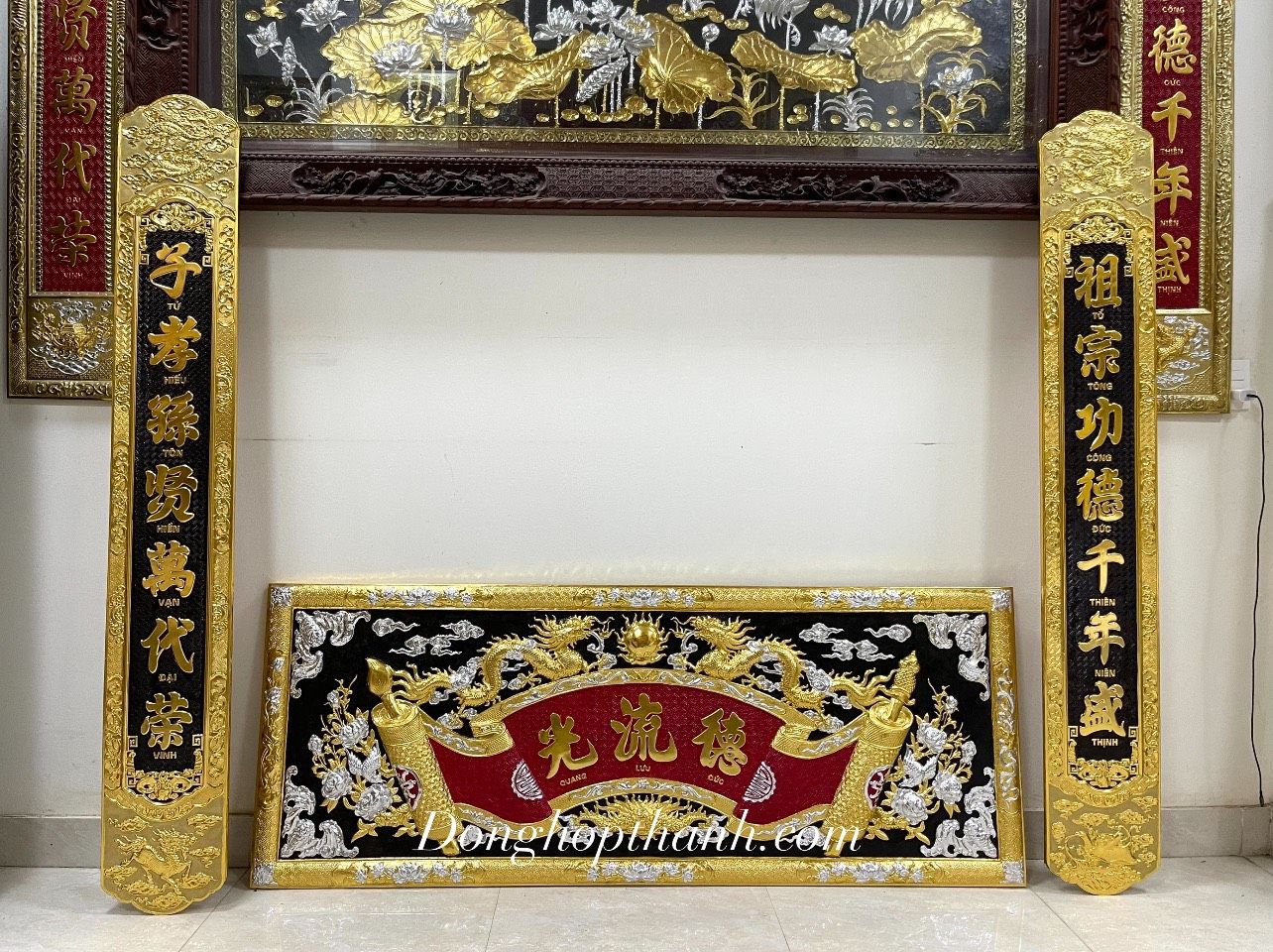 Bộ Hoành phi câu đối Đức Lưu Quang thiếp vàng bạc, kích thước 1m76