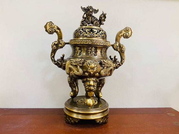 - Lư hương (đỉnh đồng) để trên ban thờ bao gồm: đế, chân, bụng, nắp đỉnh, tai mây. Đỉnh đồng gồm ba chân trụ vững chãi đứng trên đế. Phần bụng đỉnh phình ra hình bầu dục cân đối, bụng đỉnh được đôi bàn tay tài hoa khéo léo của người nghệ nhân chạm khắc hình ảnh cao quý song long trầu nguyệt, hay những dòng chữ hán mong muốn sự hòa thuận, phúc đức bình an "Phúc Lộc Thọ Khang Linh". Phía trên nắp đỉnh đồng có một con nghê ngự uy nghi, bệ vệ. Dân gian xưa lấy hình ảnh con nghê là một động vật thần thoại là biến thể từ sư tử và chó dữ với mong muốn gia chủ được bảo vệ, trong gia đình luôn có một con vật để trông nhà. Hai đỉnh mao rồng tai mây ôm lấy phần bụng đỉnh hài hòa đối xứng, góp phần tạo nên cho đỉnh đồng sự cao quý và linh thiêng.