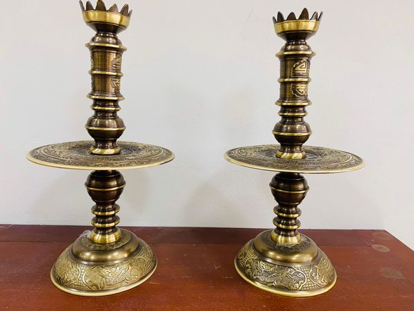 Đôi chân nến: Chân nến thờ bằng đồng được đúc thành 3 phần: phần chân đế loe vững trãi, ở giữa là bát nến, lắp ở trên miệng rộng dùng để cốc nến hoặc cắm nến cây. Kích thước của đôi chân nến phụ thuộc vào chiều cao của đỉnh đồng và kích thước của ban thờ. Ngoài việc dùng để thắp sáng tạo nên sự lung linh huyền ảo và uy nghiêm cho bàn thờ thì đôi chân nến còn mang ý nghĩa phong thủy: Chân nến bên trái tượng trưng cho hành dương, tức là mặt trời. Chân nến bên phải tượng trưng cho hành âm, tức là mặt trăng. Có âm - dương, nhật - nguyệt thì sẽ làm cho vạn vật sinh sôi nảy nở, mang lại nhiều tài lộc và may mắn cho gia chủ.