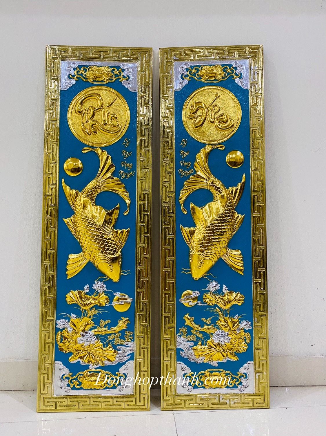 Tranh Lý Ngư Vọng Nguyệt thiếp vàng bạc - Kích thước 1m27 x 0,46m