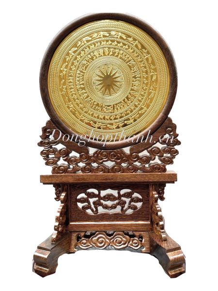 Quà tặng mặt trống đồng mạ vàng 24K + giá trống để bàn gổ cẩm - kt: Ngang 35cm; Cao 56cm