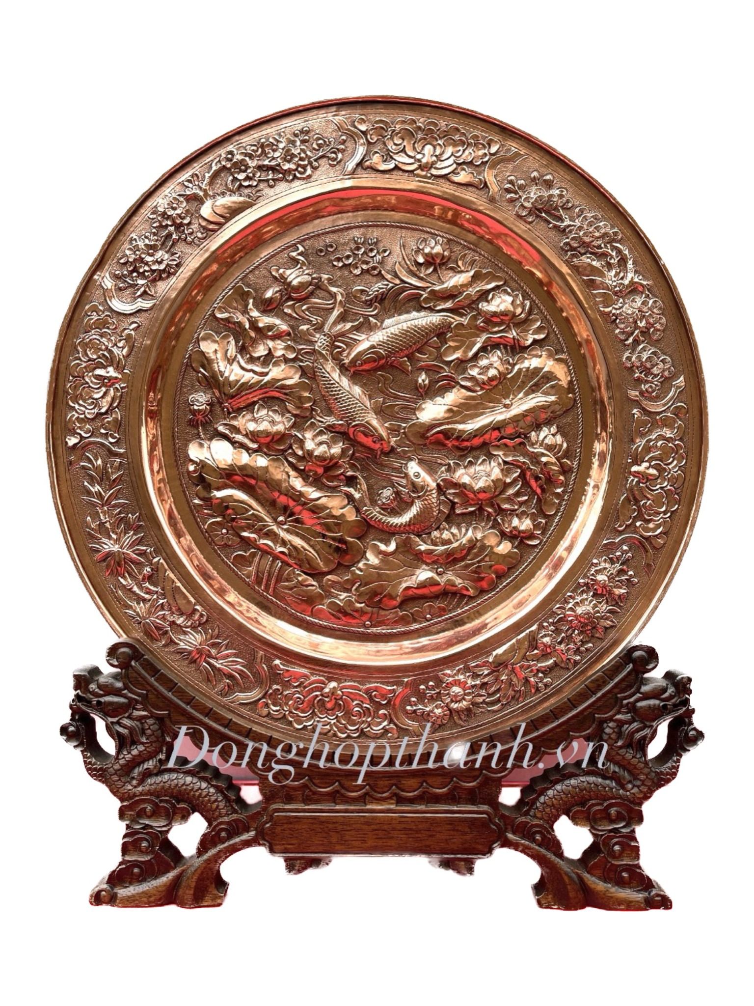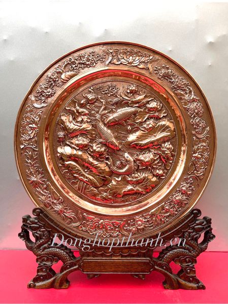 Quà tặng tranh đĩa đồng - Cá chép và hoa sen - Đường Kính 35cm; Tổng Chiều Cao 41cm