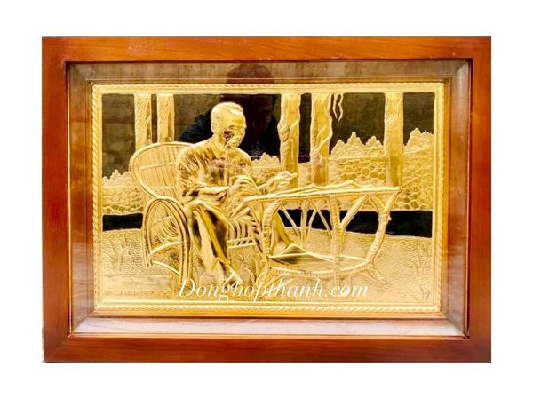 Tranh Bác Hồ ngồi ghế mây làm việc mạ vàng 24K - kích thước 38cm x 54cm