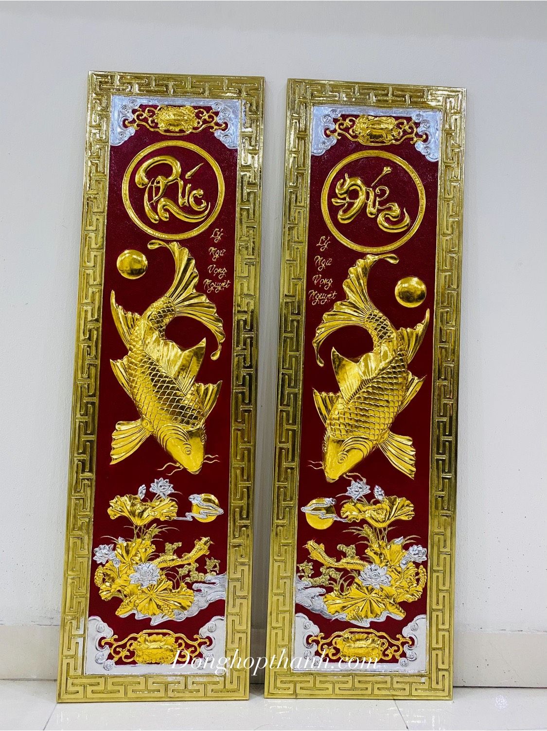 Tranh Lý Ngư Vọng Nguyệt thiếp vàng bạc - kích thước 1m27 x 0,46m