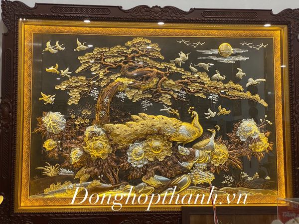 Bức tranh miêu tả đôi chim uyên ương đang hạnh phúc đứng cạnh nhau trên cành mai. Cặp chim công trong bức tranh bằng đồng thể hiện tình yêu đôi lứa, tình cảm vợ chồng nồng thắm và hạnh phúc.
