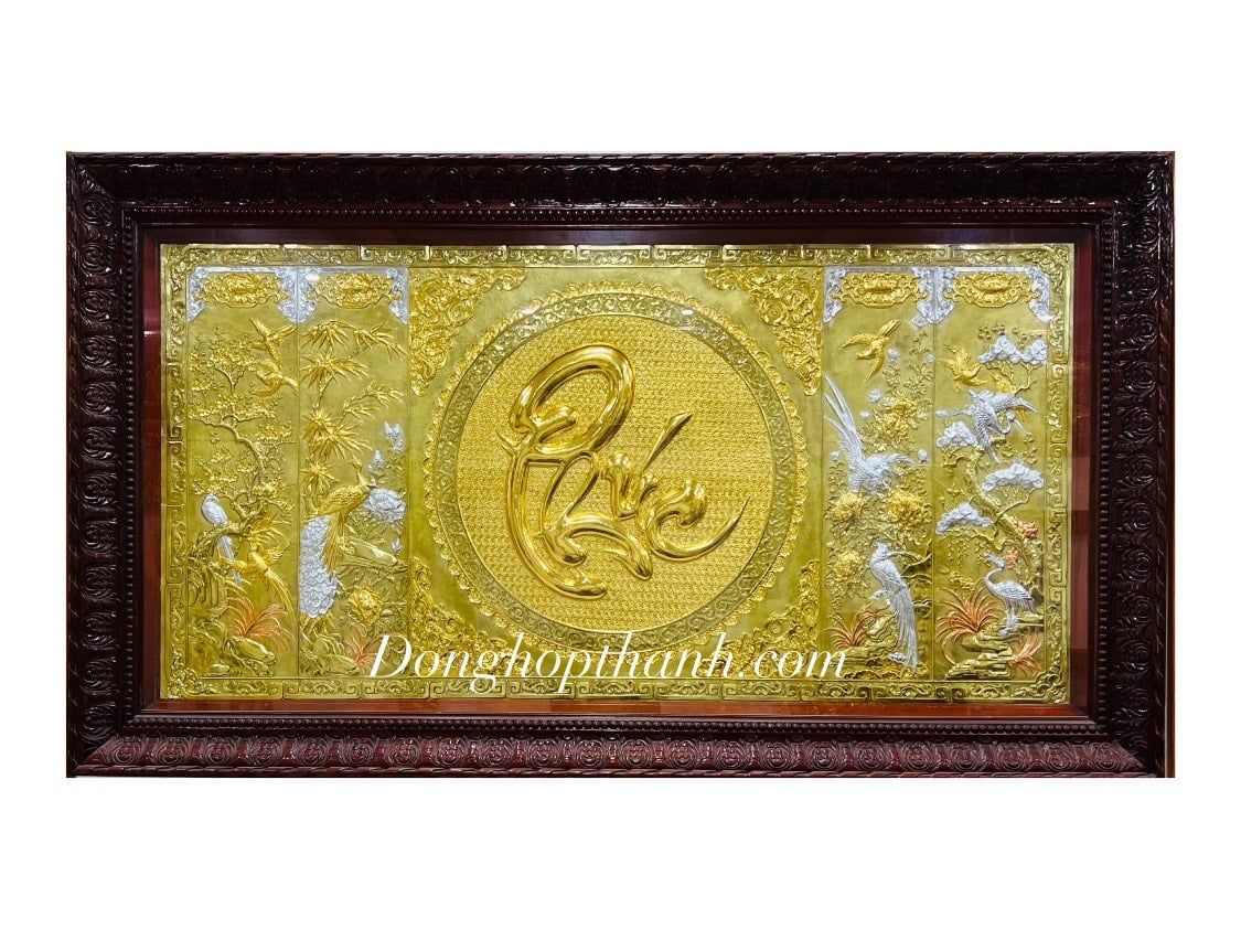 Tranh Tứ quý chữ phúc dát vàng bạc - kích thước 155cmx88cm